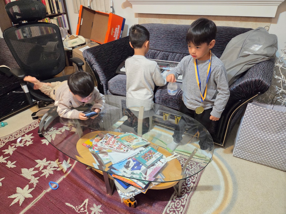 Lucien, Theo and Noah in Christmas Play Rehearsal Dec. 18/2025
