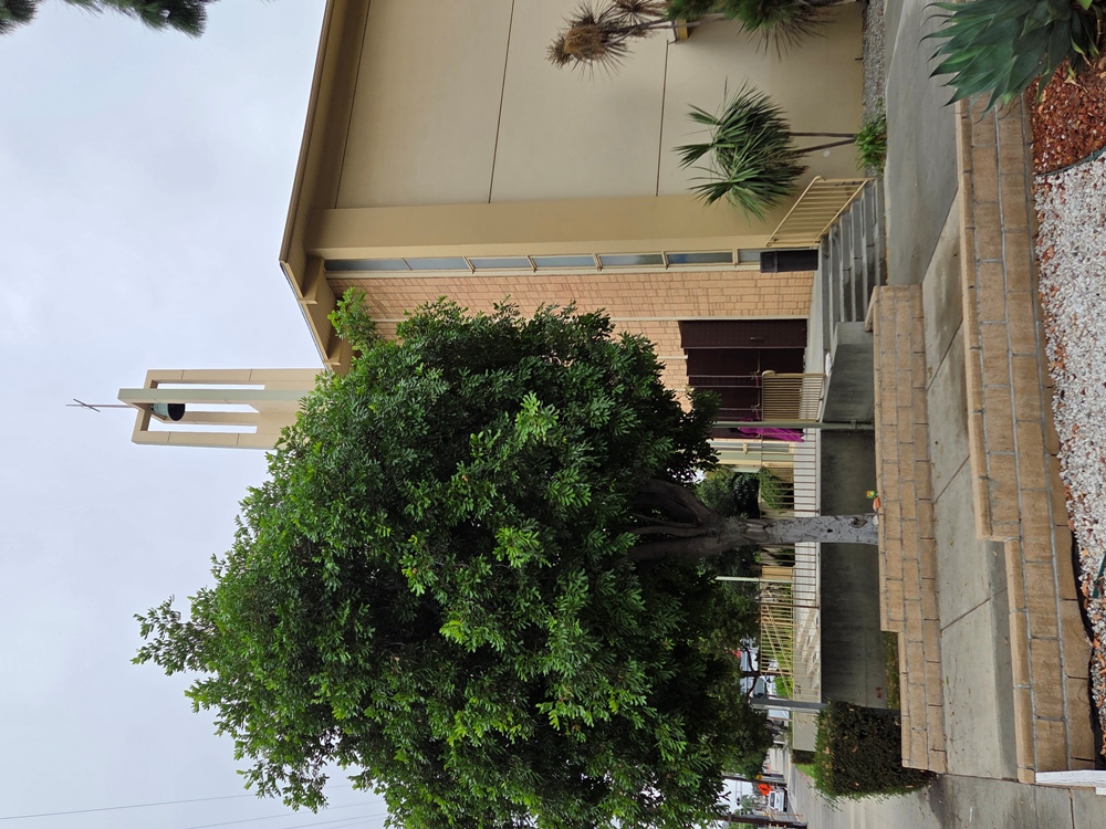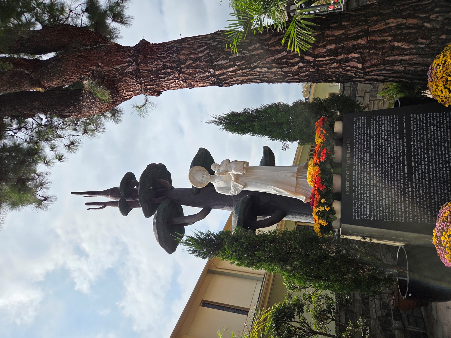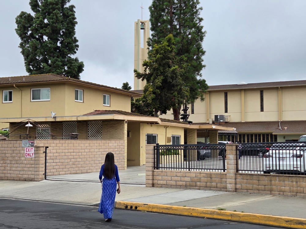 Nhà xứ ở sát bên đường, và trong khuôn viên Nhà xứ có Tượng đài Đức Mẹ Lavang của Cộng đoàn Công giáo Việt Nam