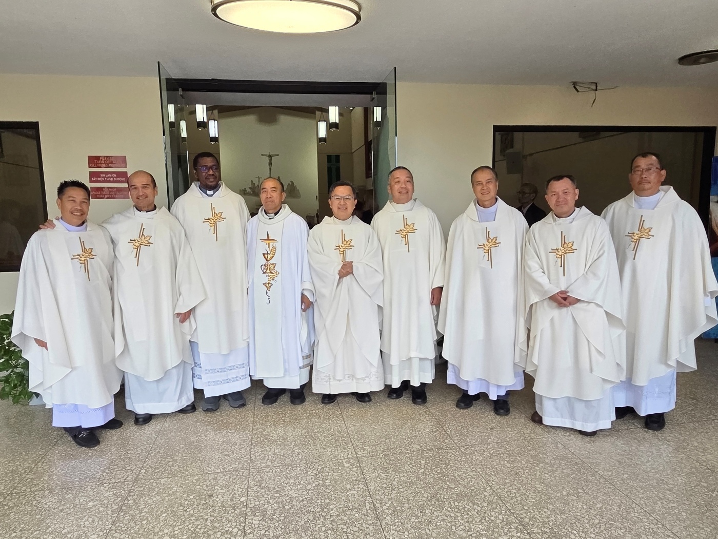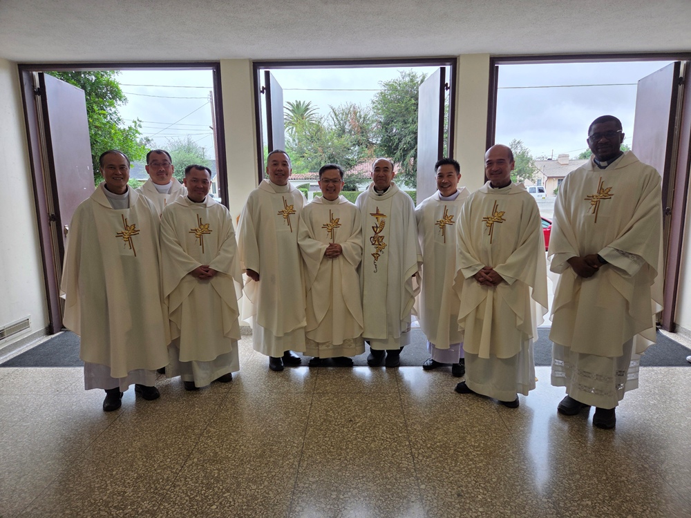 Cha Chánh xứ: Fr. Roberto Jaranilla Jr (thứ 2 từ trái); Cha Tuyên Úy TNF TGP LA: Nguyễn Huy Bảo (đứng giữa 9 cha)