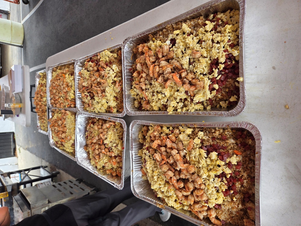 Các em TNF Đoàn El Monte phụ bếp bưng đồ ăn lên các bàn đang dàn chào với 3 ngón giơ lên ám chỉ cùng nhắc nhở TNF rằng: