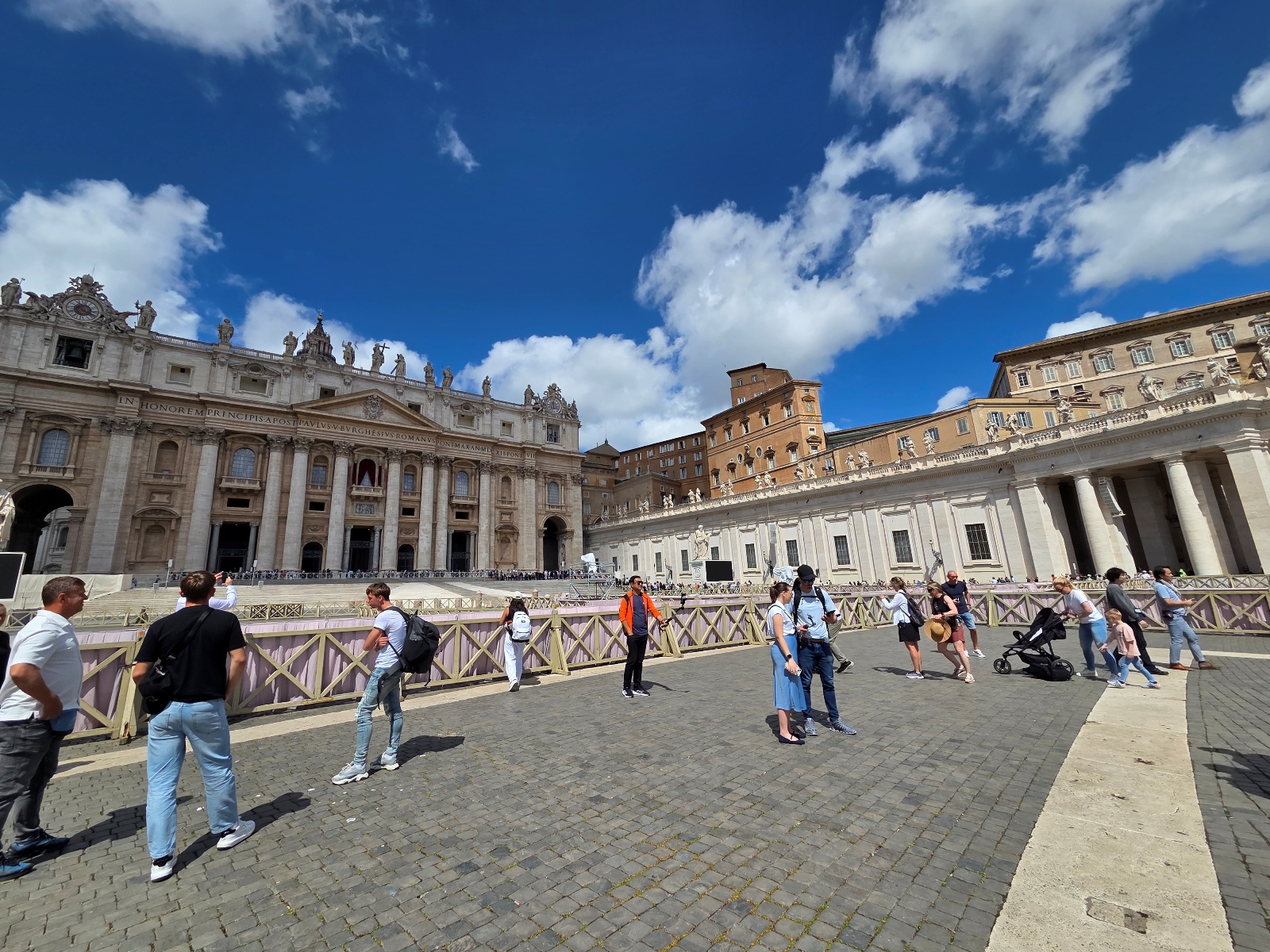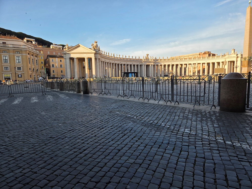 Mới 7 giờ sáng nên trong lòng Quảng trường Thánh Phêrô còn thanh vắng... nhưng hai bên hông đã có đoàn người hành hương xếp hàng sẵn để được vào kính viếng Đền Thờ Thánh Phêrô