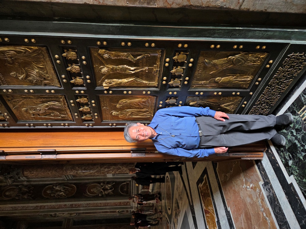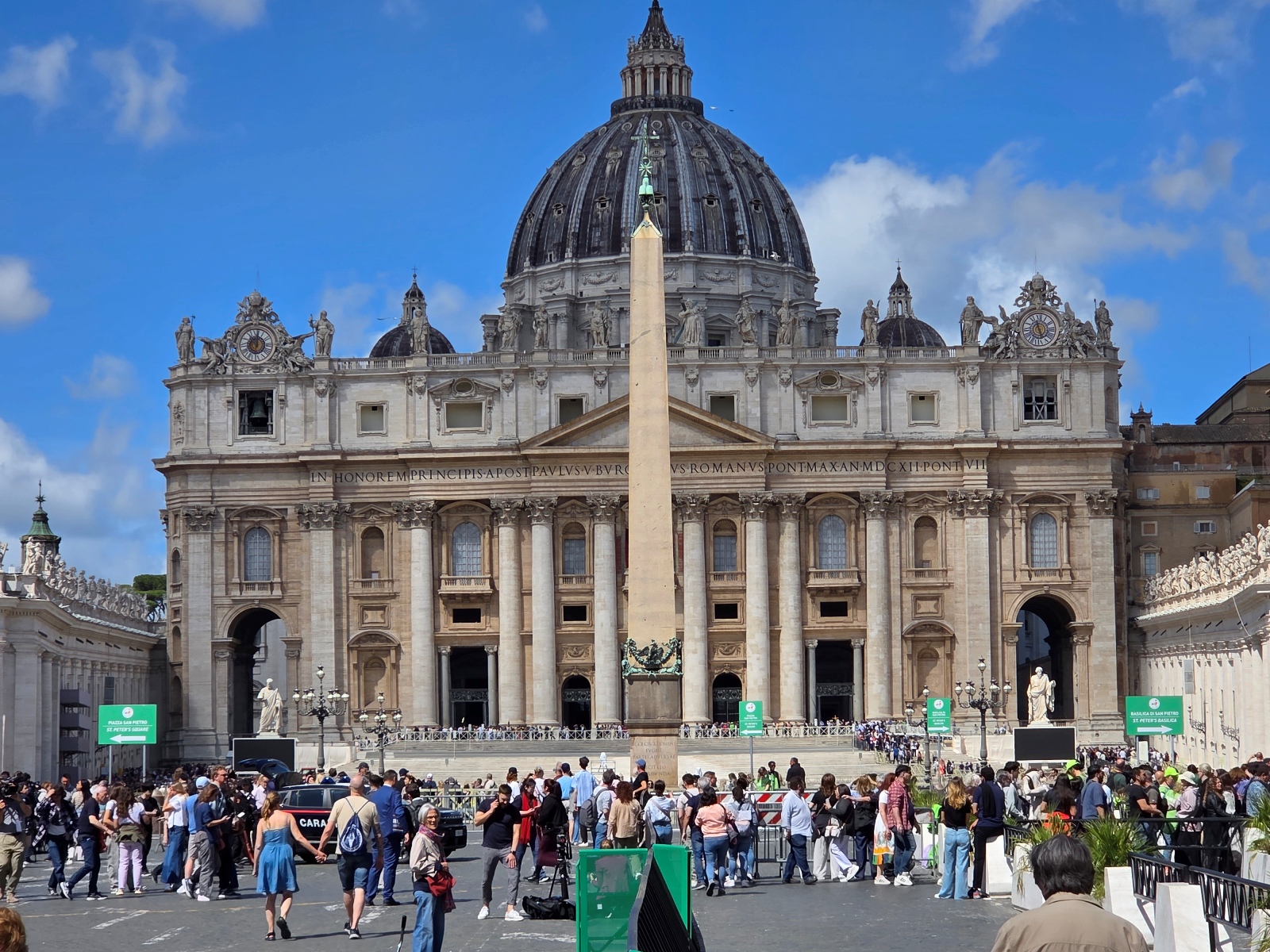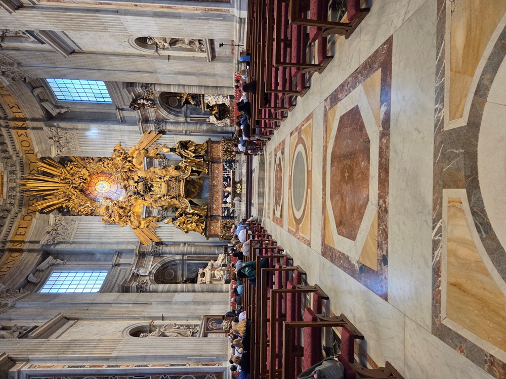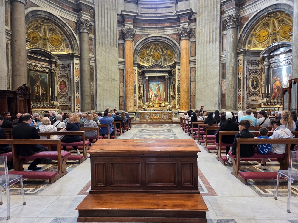 Trong chuyền hành trình đột xuất Hành Hương Năm Thánh Lữ Hành Hy Vọng Tiễn Cựu Nghinh Tân Nhị Vị Giáo Hoàng Phanxicô và Lêo XIV, phái đoàn TĐCTT đã đến kính viếng Đền thờ Đức Bà Cả 5 lần, Đền Thờ Thánh Phaolô Ngoại Thành Roma 2 lần và Đền Thờ Gioan Lateranô 1 lần thì Đền Thờ Thánh Phêrô 3 lần: Lần thứ nhất vào sáng Thứ Sáu 25/4/2025 để viếng xác Đức cố Giáo Hoàng Phanxicô, như đã được tường trình trong bài tường trình đầu tiên Đức cố Giáo hoàng Phanxicô: Viếng xác và An táng (25-26/4); lần hai vào sáng Thứ Bảy mùng 3/5/2025 để tham quan Vòm Đền Thờ (thay cho sáng Thứ Sáu hôm trước), sau đó dự lễ 9 giờ sáng, và lần ba vào Thứ Sáu mùng 9/5/2025 để dự lễ 8 giờ sáng và cầu nguyện cho Đức tân Giáo hoàng Lêô XIV rồi sau lễ xuống hầm Đền thờ để kính viếng mộ của Thánh Phêrô cùng mộ của các vị Giáo hoàng. Phái đoàn TĐCTT vẫn tiếc mãi vì đã bị missed một cách oan uổng dự lễ khai mạc Mật nghị Hồng y sáng Thứ Tư ngày 7/5/2025 ở trong Đền Thờ Thánh Phêrô.