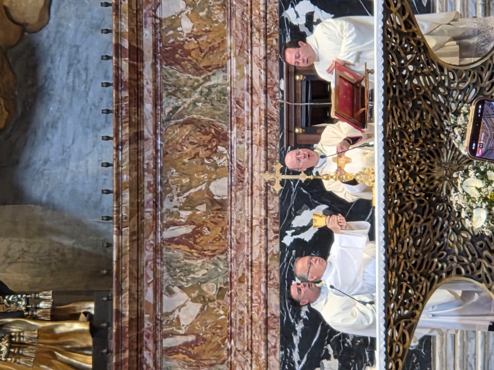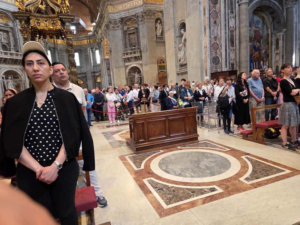 thì hôm nay, Thứ Sáu mùng 9/5/2025, phái đoàn dự lễ 7 giờ rưỡi sáng ở Bàn thờ Ngai Tòa ở sau Bàn Thờ chính rồi mới xuống hầm mộ các vị Giáo hoàng