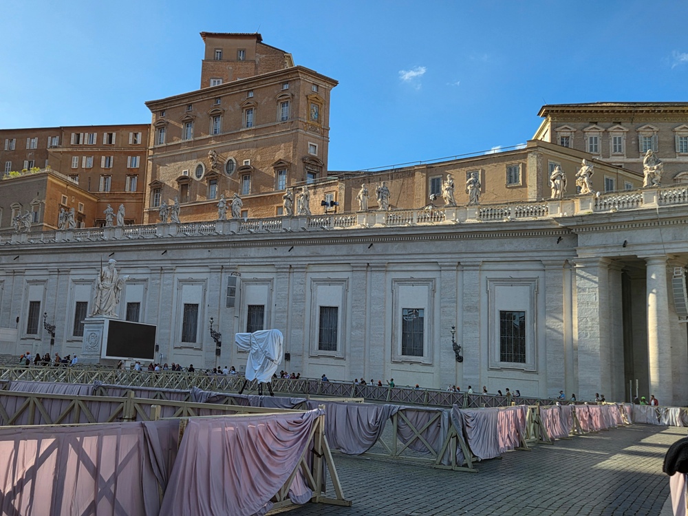 Đền thờ Thánh Phêrô - Cửa sổ có bức màn đở là Ban công xuất hiện các vị tân Giáo hoàng, mới đây nhất vào chiều Thứ Năm mùng 8/5 là Đức tân Giáo hoàng Lêô XIV.