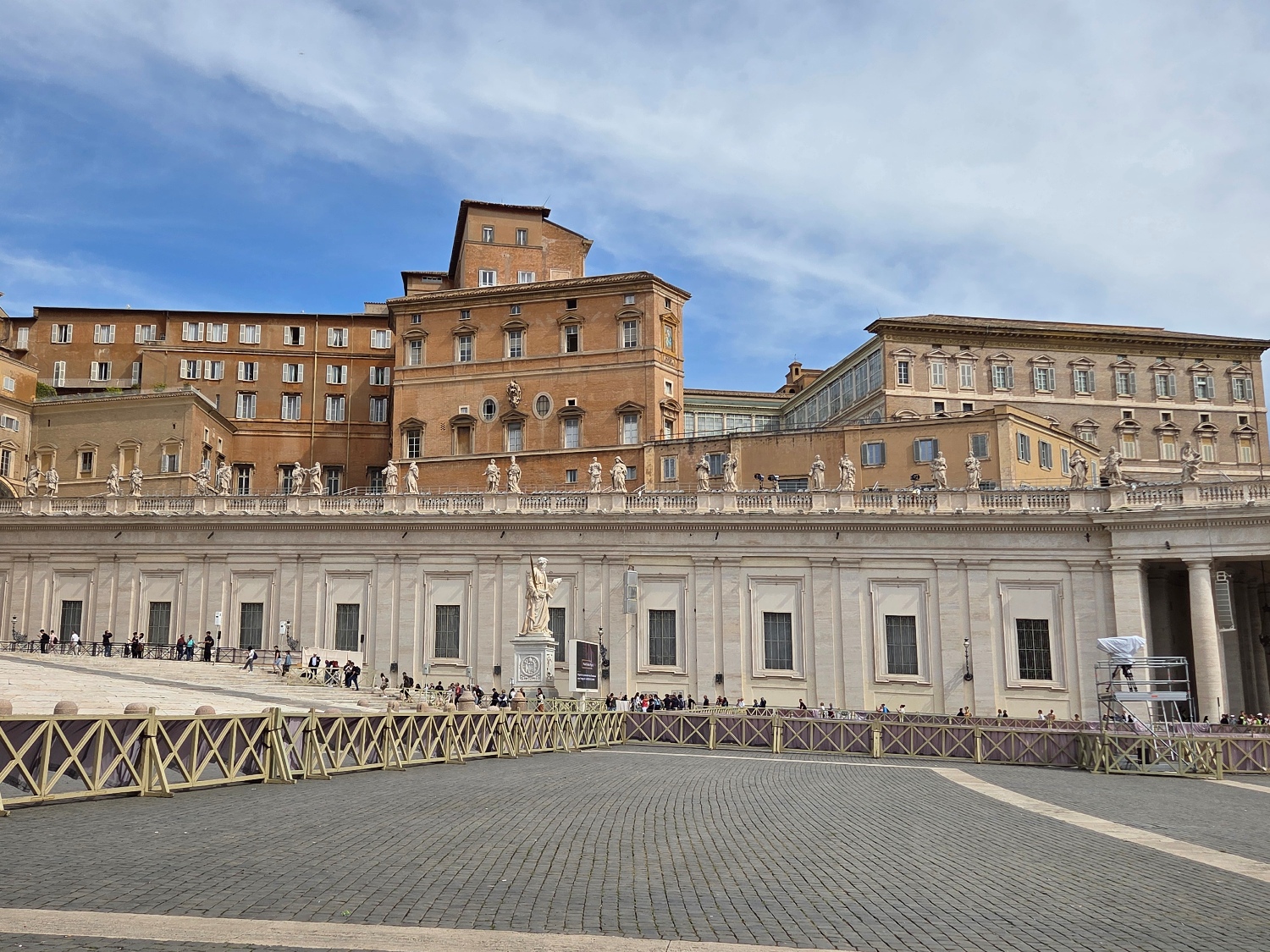 Bên trái Đền thờ hay ở hướng bắc là Phủ Giáo hoàng và Tông dinh Giáo hoàng; cửa sổ thứ hai cuối bên phải hướng đông là nơi ĐTC nguyện Kinh Truyền Tin / Nữ Vương trưa Chúa Nhật hàng tuần.