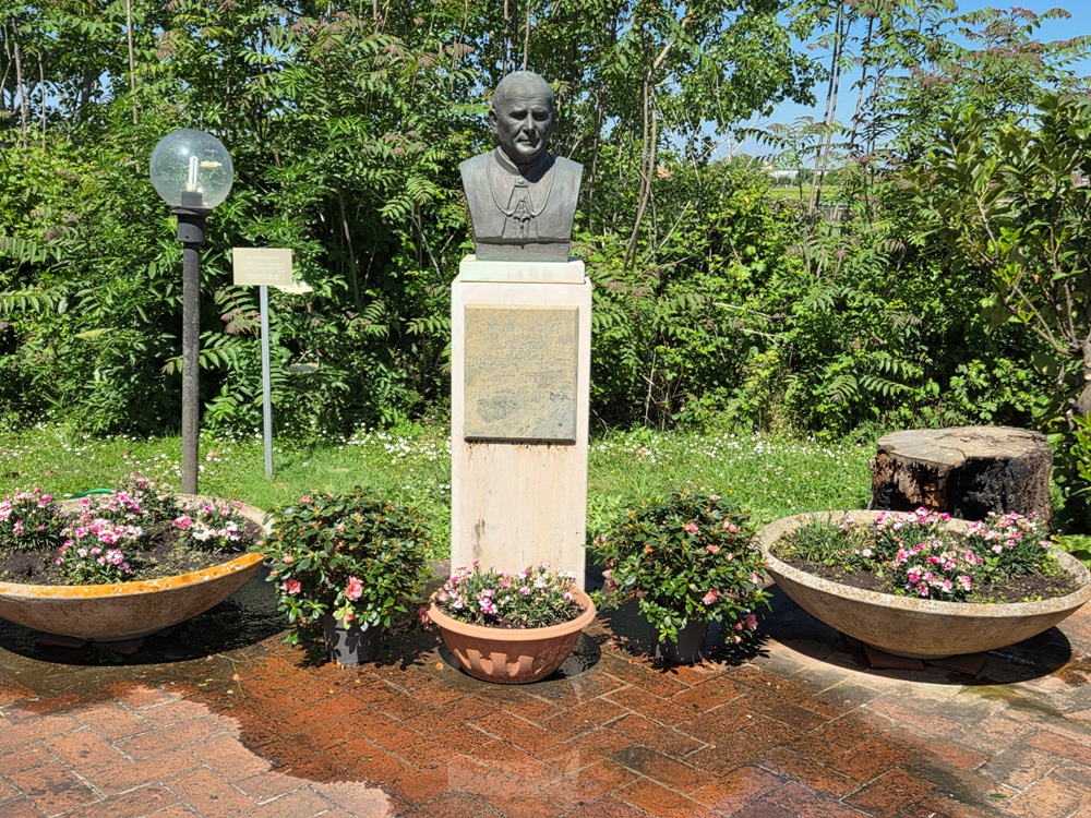 Bức tượng ĐTC Gioan Phaolô II ở đầu nhà phía đằng trước Đền Gia cư Thánh Maria Goretti
