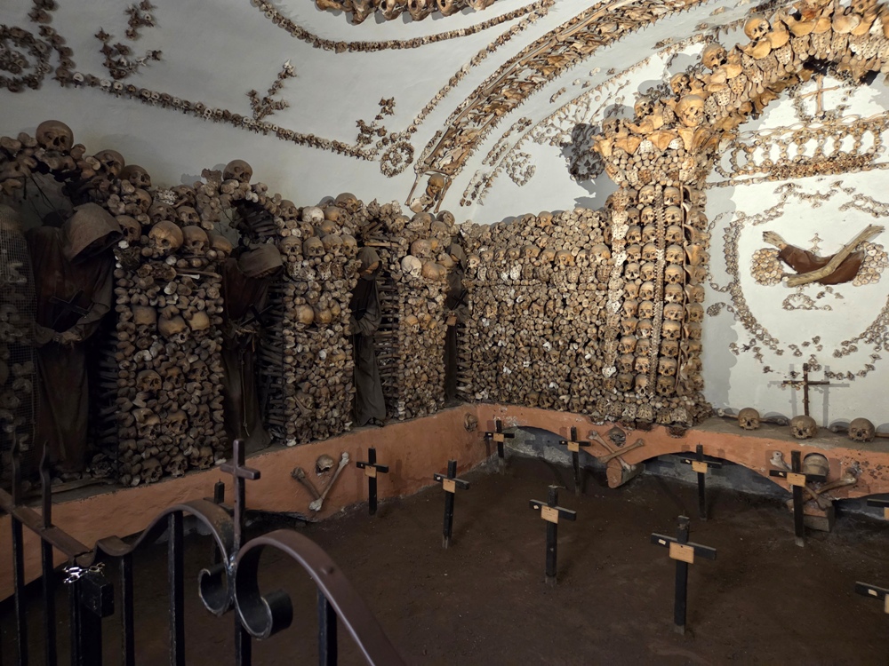 Trên tường có cả ngàn xương ống chân, xương đùi và xương sọ, chưa kể đến những bộ khung xương mặc áo dòng Capuchin.