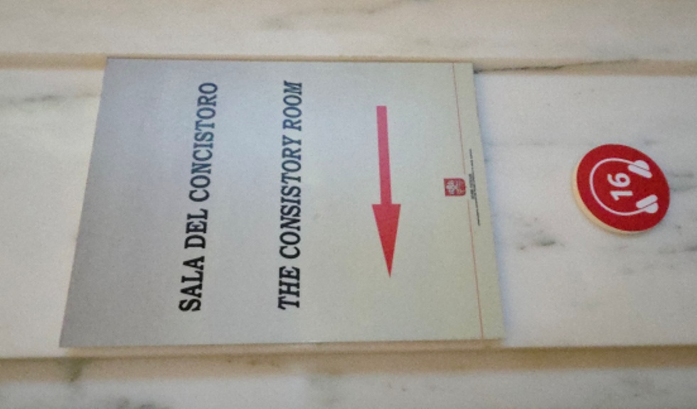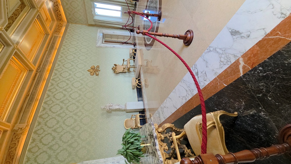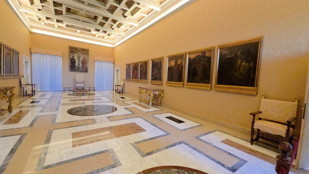 Khách tham quan tiến vào nội cung Cung điện Giáo hoàng ở Castel Gandolfo trước hết là một phòng mờ tối