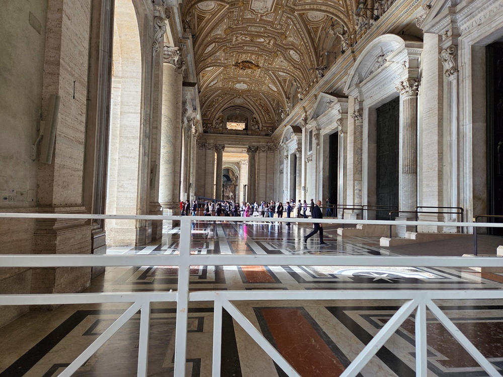 Từ bên trái ở trên tiền đường Đền Thờ Thánh Phêrô nhìn xuống Quảng trường Thánh Phêrô - Bàn thờ ở chính giữa tiền đường Đền thờ cũng đang được sửa soạn