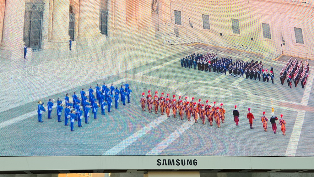 Tuy nhiên, trước đó, trong khi chờ đợi, là các màn trình chiếu về nghi thức dàn chào sẵn ở phần trước tiền đường Thánh Phêrô