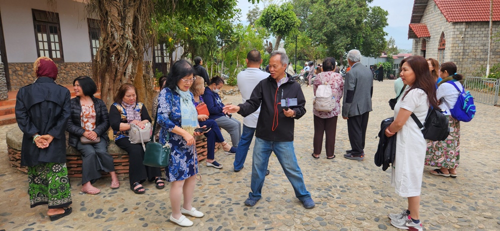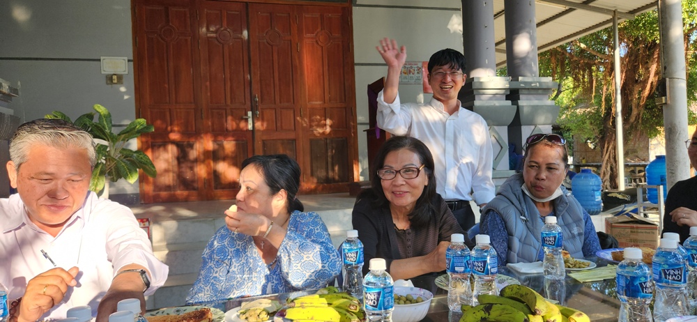 Phái đoàn TĐCTT ngồi nghỉ sau hơn 1 tiếng trên xe từ Giáo họ Truyền giáo Lương Giang tới Giáo xứ Truyên giáo Bà Râu này
