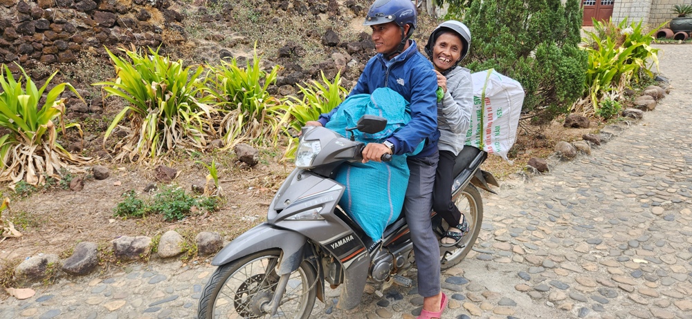 Được trung chuyển bằng xe gắn máy ở Việt Nam trên con đường đất chật hẹp khiến anh chị em vừa hồi hộp lại vừa hào hứng