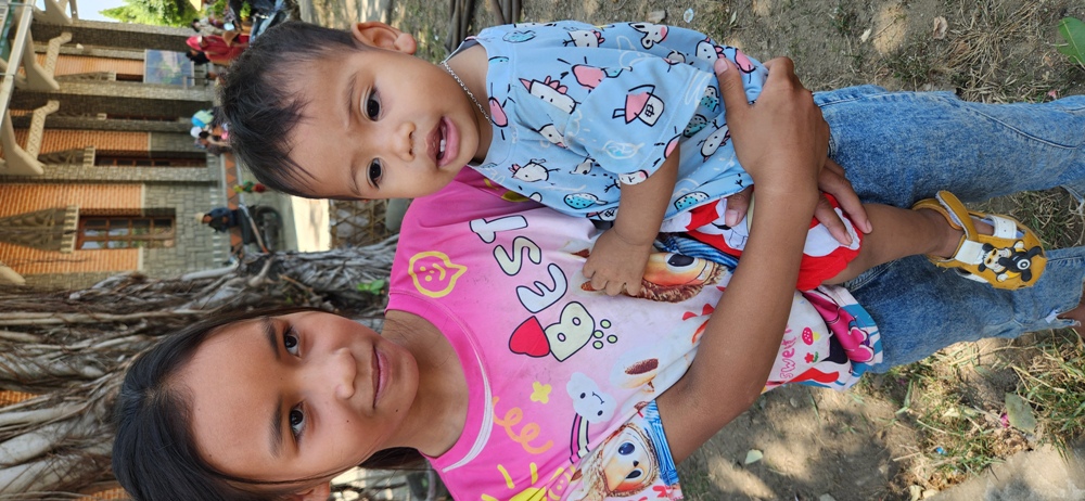 Con em trong cộng đoàn đi theo cha mẹ lĩnh quà còn được món quà riêng "ăn liền" em nào cũng ham thích