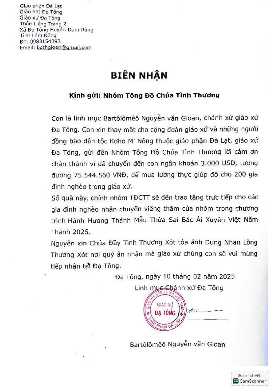 Chứng Nhận Thư của Cha Chánh xứ về Quà Tặng Truyền Giáo của Nhóm TĐCTT