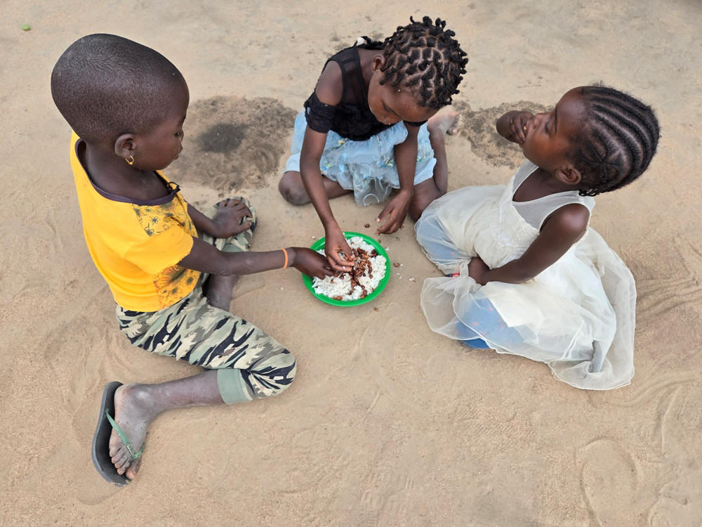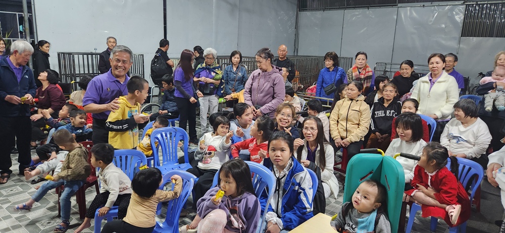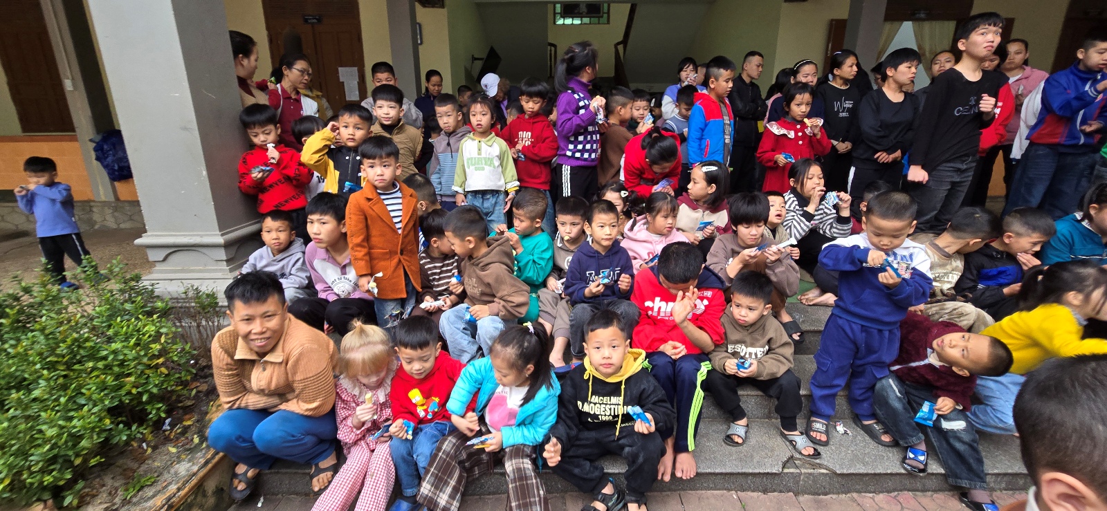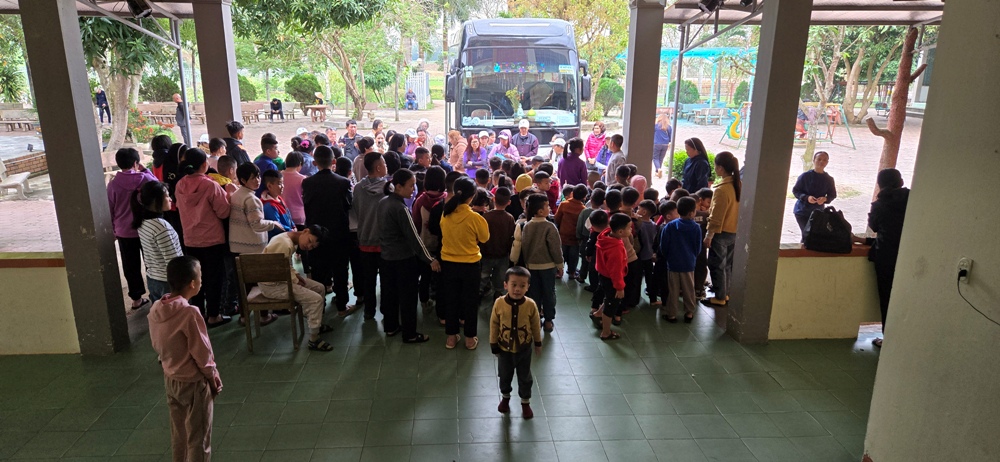 anh chị em trong phái đoàn đã sẵn sàng quà bánh cho các em mỗi khi đến những nơi có các em như thế này