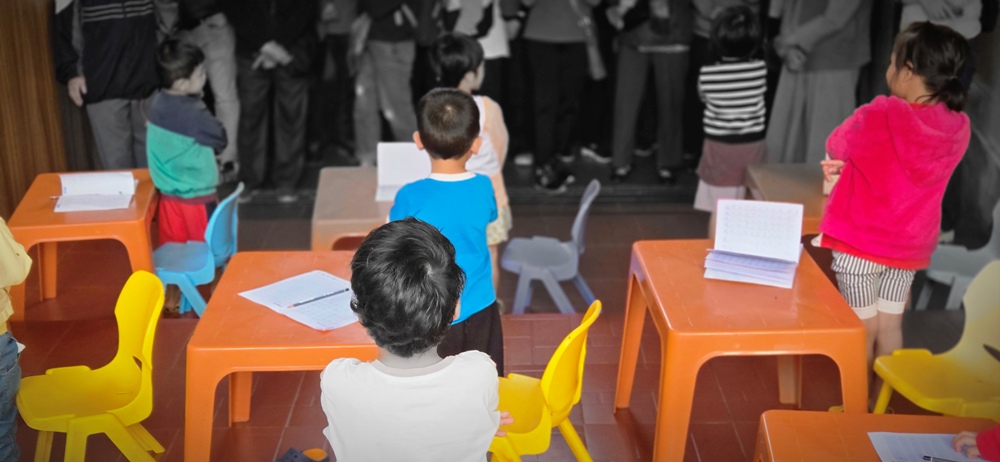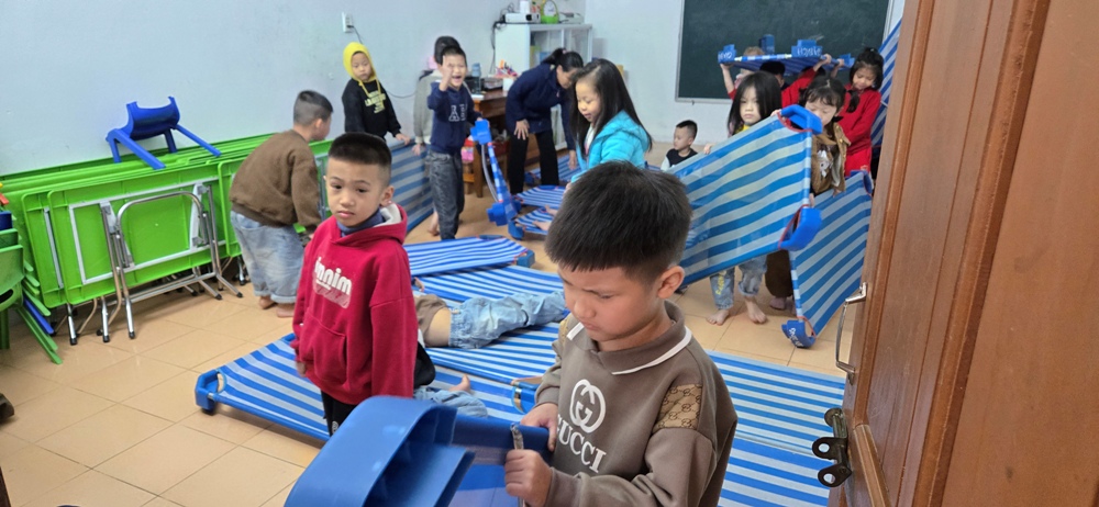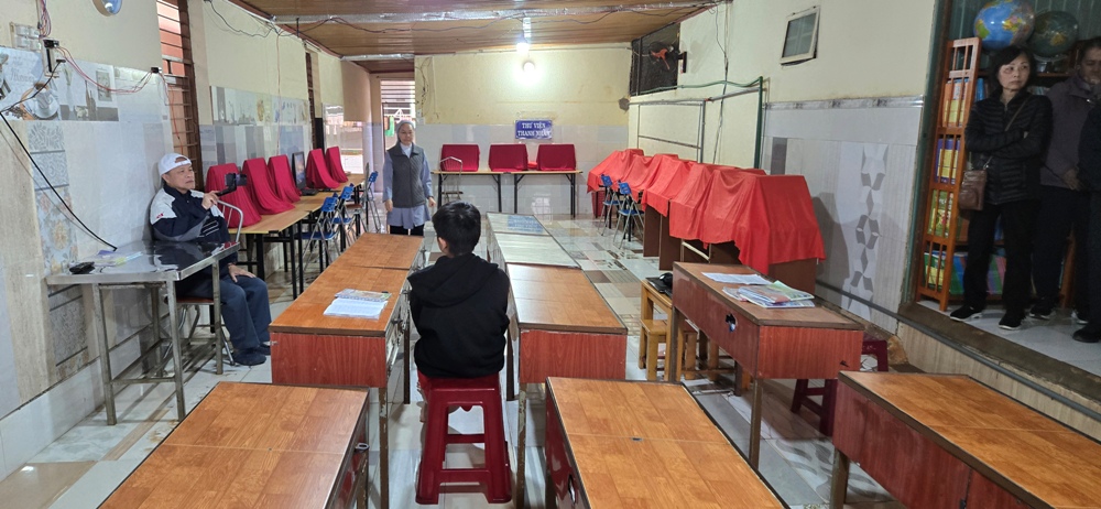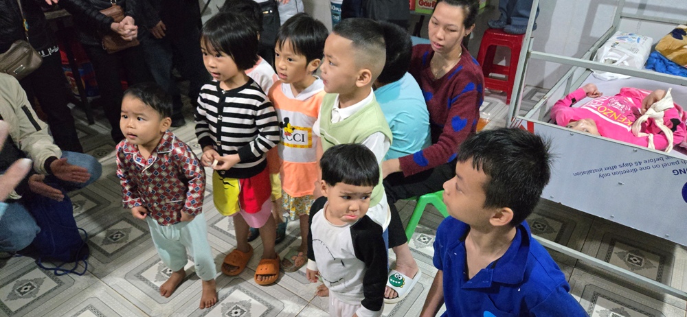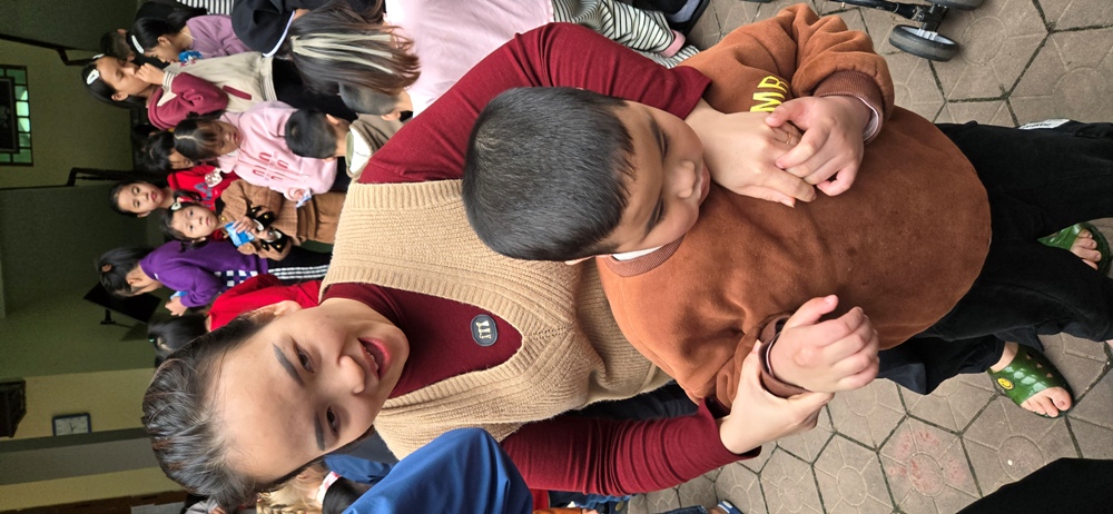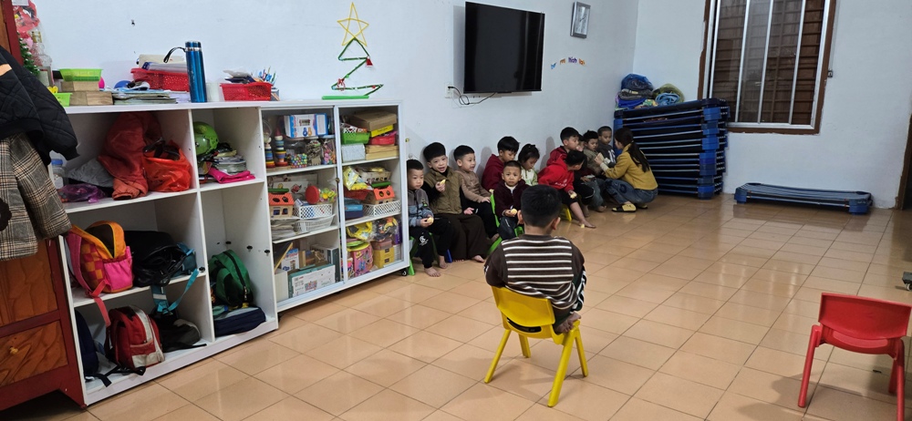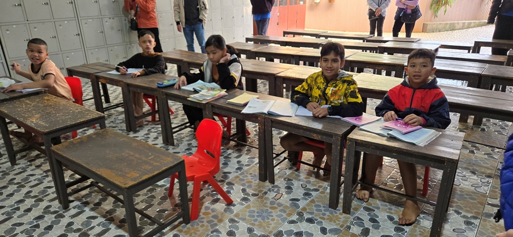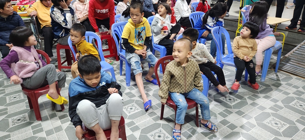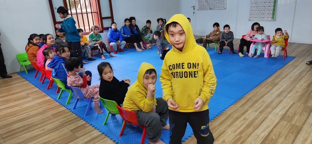 Các em đang ngồi chờ phái đoàn, trong đó 1 em đứng ngay lên khi phái đoàn vừa tới cửa