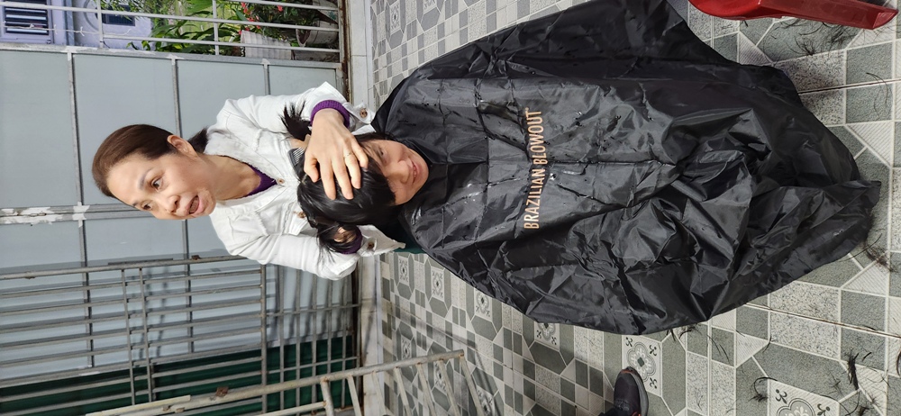 Chị Trần Vũ Mùi, chuyên nghiệp làm tóc ở Houston Mỹ quốc, mang sẵn đồ nghề để hành nghề bất cứ lúc nào có thể