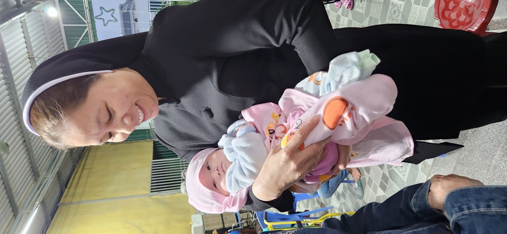 Sơ Bề trên Dòng MTG Vinh TPT Nguyễn Thị Nga ôm ẵm một tặng ân Chúa ban cho chung nhân loại: một sự sống, một con người!