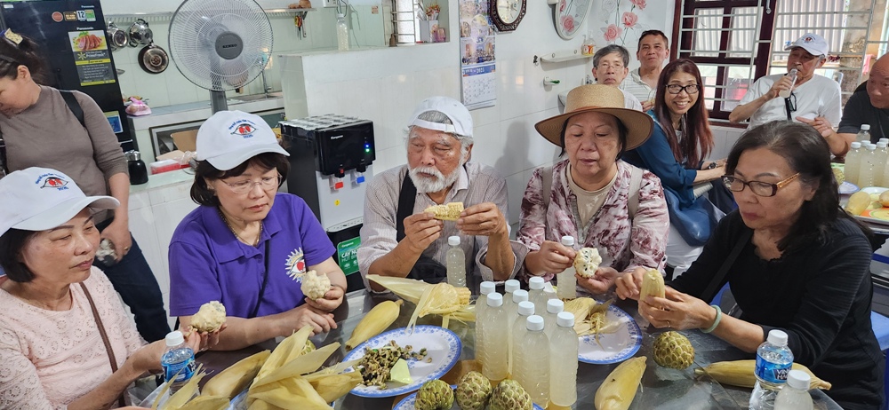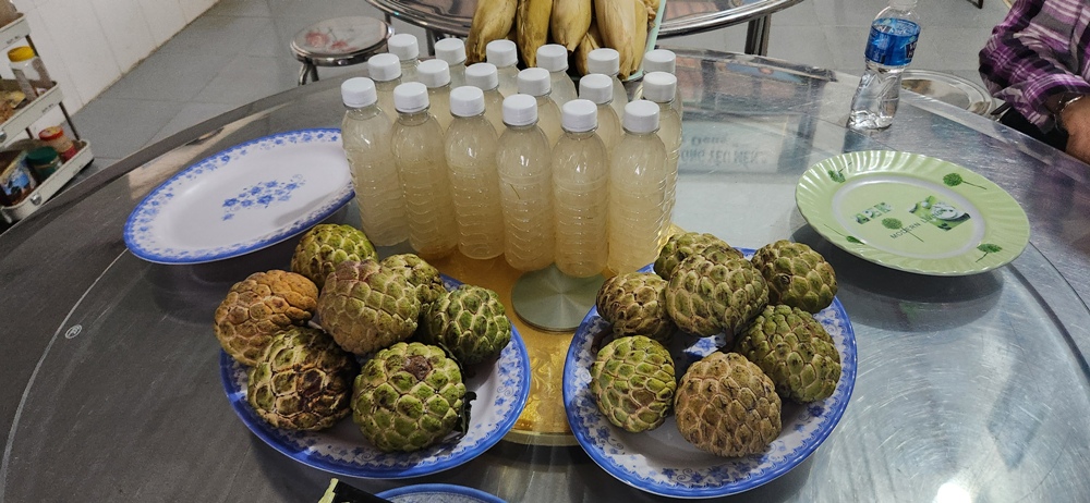 Ở Cơ sở Tầm Ngân phái đoàn thưởng thức dừa non và bắp ngô thì ở cơ sở Bà râu này là na và ngô bắp kèm theo nước dừa chai thì phải...