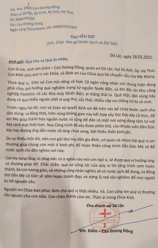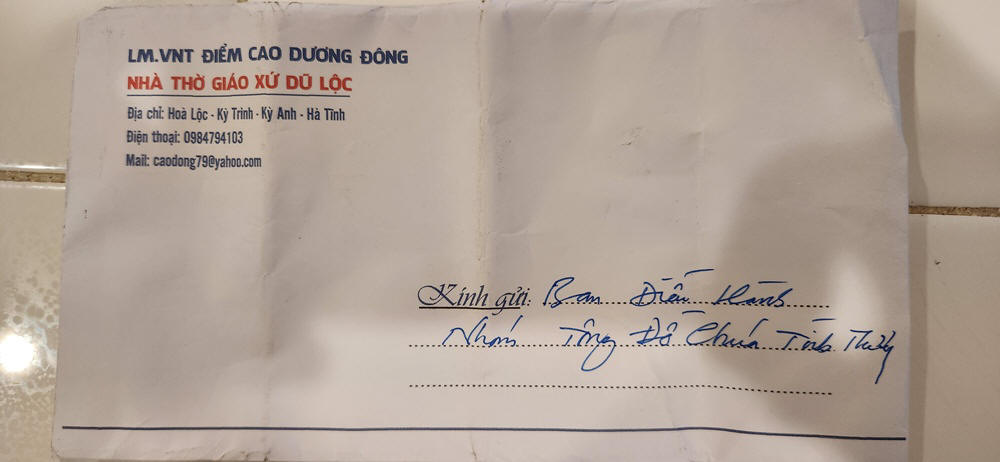 vì ngài không thể hiện diện vào thời điểm phái đoàn đến tặng quà cho các nạn nhân Formosa ở Hà Tĩnh và Quảng Bình