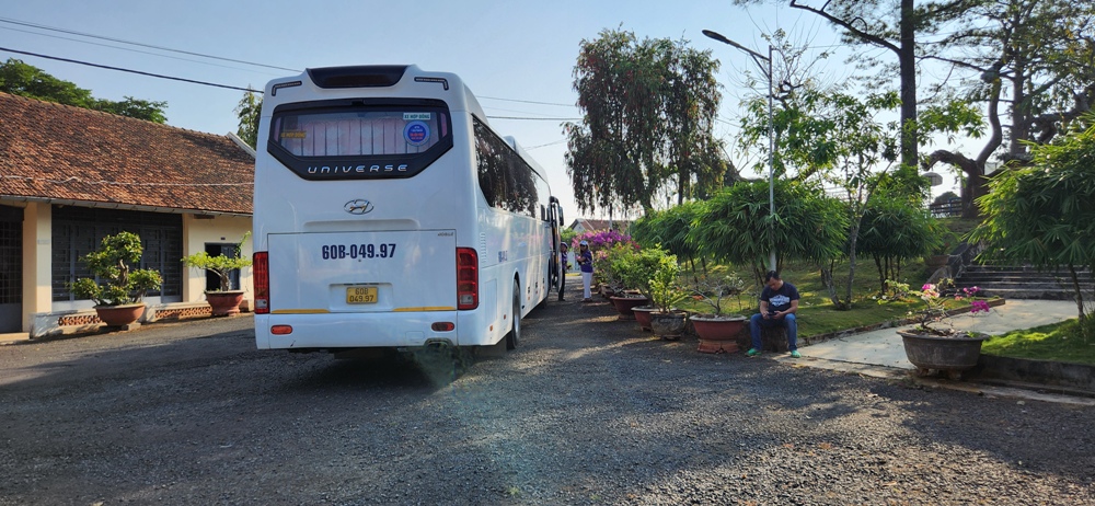 Xe tour bus của phái đoàn đậu ngay trước hội trường vừa mới khánh thành ngày phái đoàn TĐCTT tới tối hôm Thứ Bảy 22/3/2025