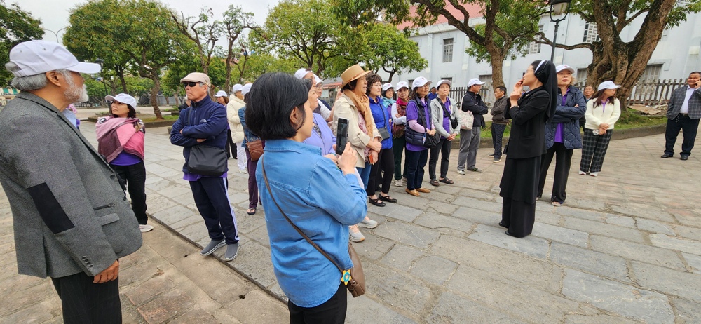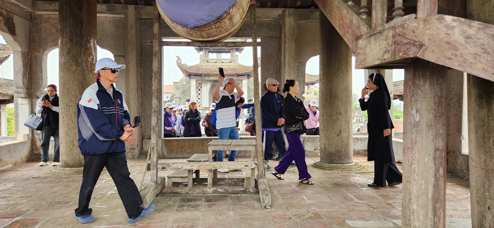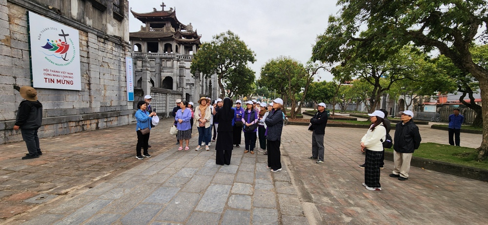Người nữ tu hướng dẫn viên hành hương quần thể Nhà thờ Phát diệm này đứng lại từng nơi để dẫn giải chi tiết cho phái đoàn nghe