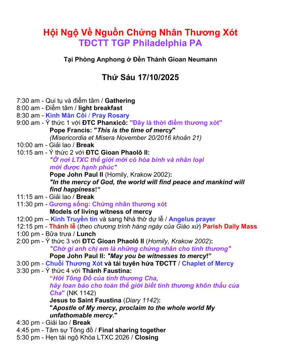 Theo dự tính và phác họa đã được chính thức thông báo thì chuyến đi này, sau Nhóm TĐCTT ở TGP Detroit MI Thứ Tư 15/10 và ở TGP Philadelphia PA Thứ Sáu 17/10 sẽ tới GP Rochester NY 2 buổi chiều Thứ Bảy 18/10 và Chúa Nhật 19/10. Tuy nhiên, theo sự an bài thần linh của LTXC, Ngày Hội Ngộ Về Nguồn Chứng Nhân Thương Xót Nội Bộ TĐCTT Ở GP Rochester NY được dời vào Thứ Bảy 29/11/2025, ngày hội ngộ về nguồn TĐCTT cuối cùng trong Năm Thánh 2025 này.