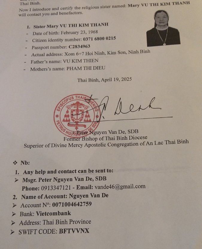 Vâng chúng con sẽ lấy hẹn với nhà băng để chuyển ngân về Hội dòng Tông