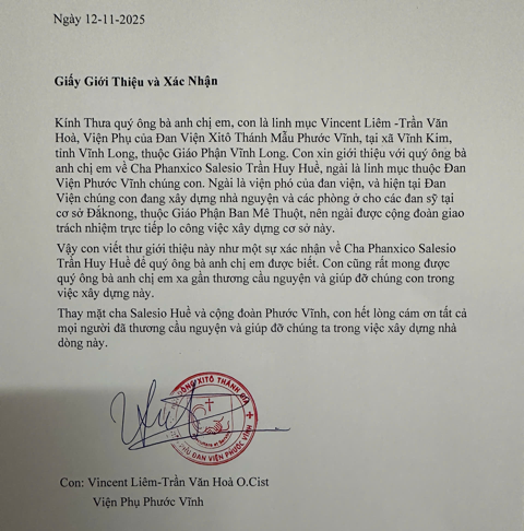 chúng con một Chứng Nhận Thư, bằng tiếng Việt cũng được nhưng bao gồm 2 danh