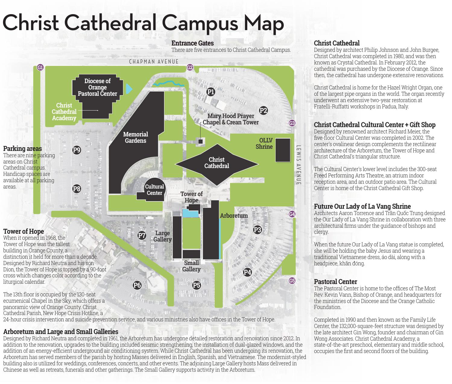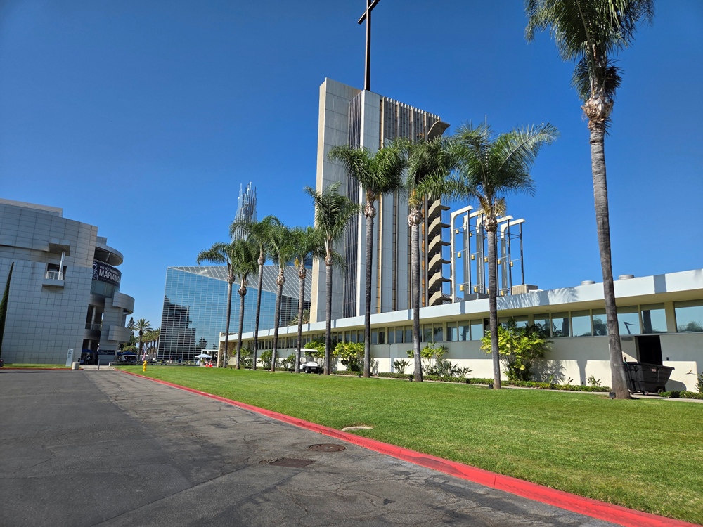 Từ bãi đậu xe phía tây mới thấy quần thể cấu trúc chính thức của Nhà thờ Chính tòa GP Orange: Tháp chuông, Nhà thờ, Cultural Center và Tower of Hope