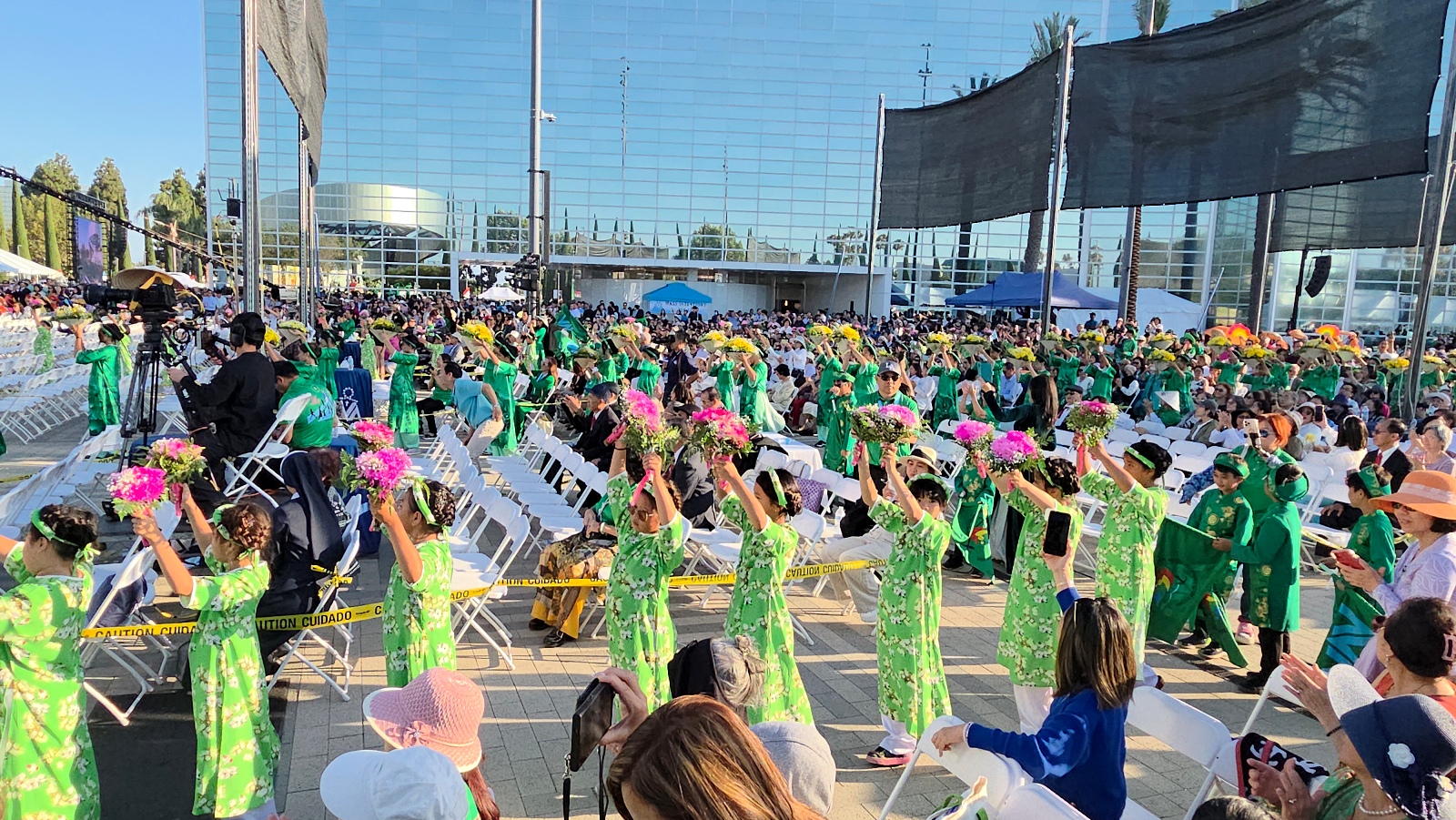 Các nữ tu MTG Los Angeles / Phát Diệm cùng với ban MC vừa hát theo máy vừa làm cử điệu mẫu theo ý nghĩa của bài "Bước đi bên Mẹ"