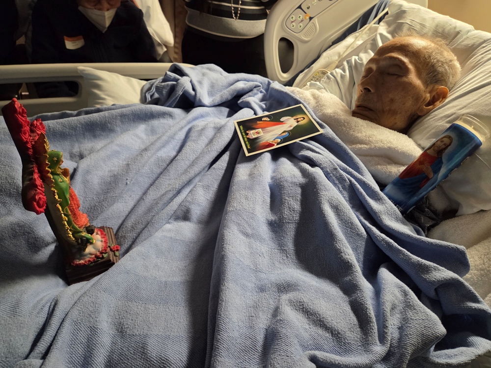 Con cái đang cùng nhau cầu nguyện cho người cha của mình bên giường chết của ông với 1 Chuỗi Mân Côi và 1 Chuỗi Thương Xót.