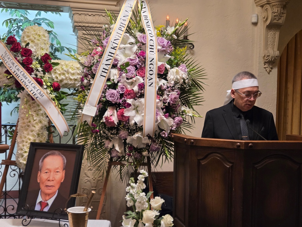 Trưởng nam Bùi Anh Tuấn tâm sự về Người Cha quá cố của mình, trước khi người chị cả Thúy Nga thay mặt tang gia ngỏ lời cám ơn Quý Cha và Quý Vị