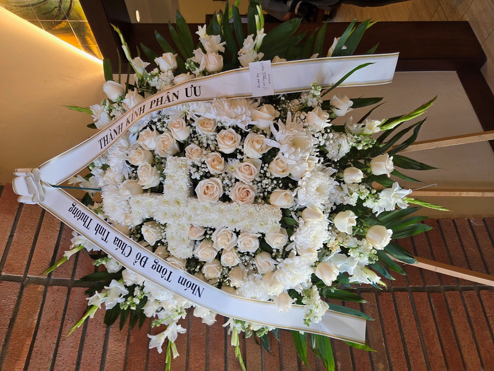 4 vòng hoa được phủ trên ngôi mộ vừa được phủ đất, trong đó còn rõ vòng hoa của Nhóm Tông Đồ Chúa Tình Thương