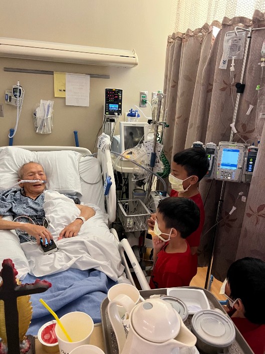 gia đình Cháu Cao Buì Minh Kha (Michael) với 3 chắt (2 chắt nhỏ Theo và Noah dâng lễ cho cụ trong giấc ngủ thiên thần)