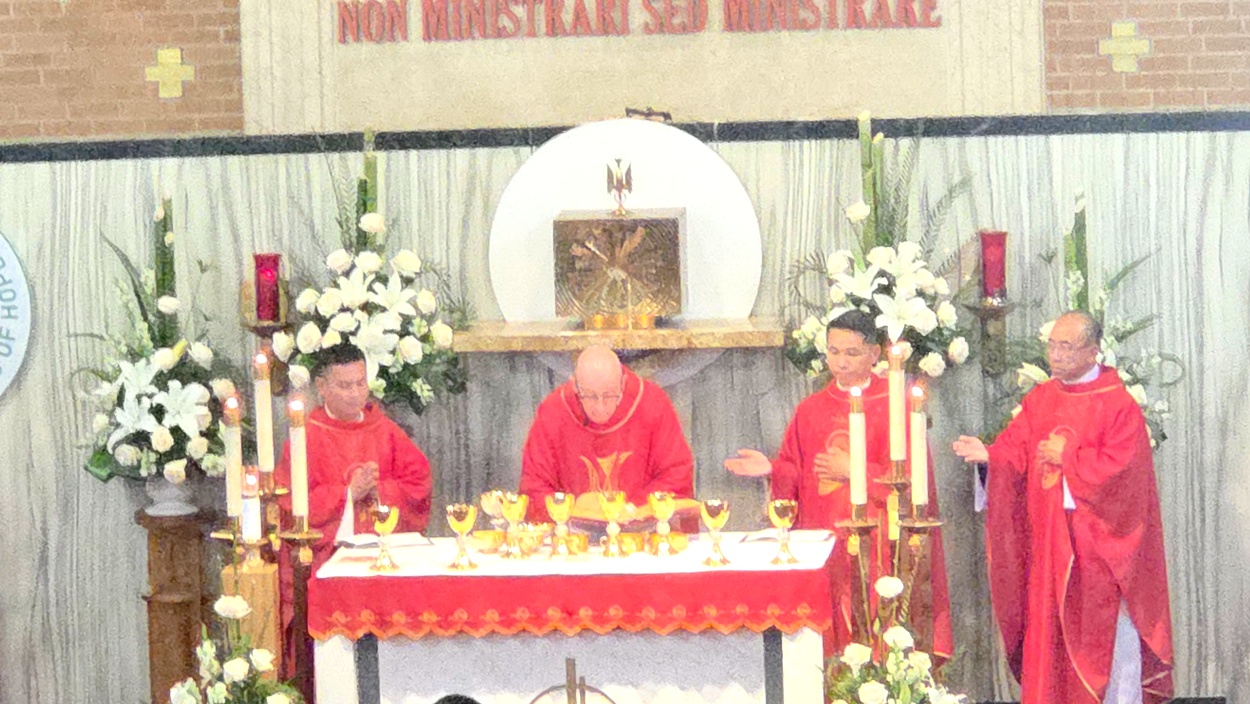 Trong linh mục đoàn đồng tế trên cung thánh còn 1 vị linh mục ngồi xe lăn ở cửa trên gần phòng áo: Fr. Hilary M. Nguyễn Hải Khánh, CRM