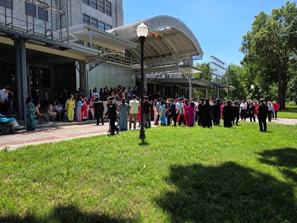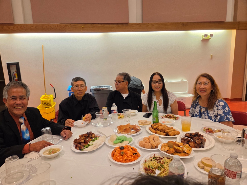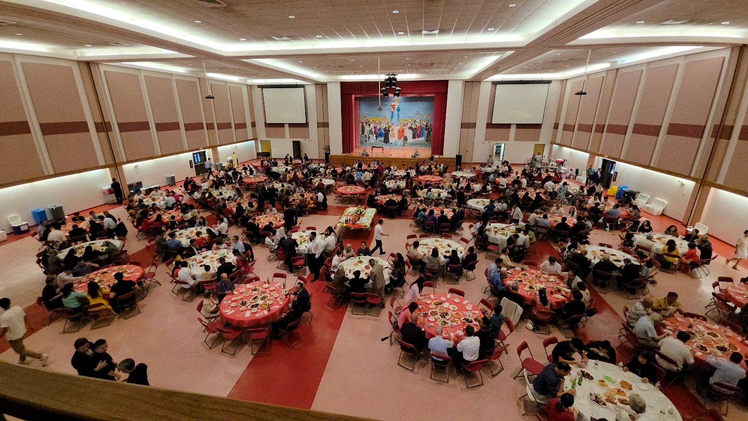 Cảnh tượng cộng đoàn Dân Chúa bắt đầu hoan hưởng các món được anh em Tỉnh Dòng dọn mừng 3 tân Linh mục ở Hội trường Các Thánh Tử Đạo trưa Chúa Nhật Hiện Xuống mùng 8/6/2025