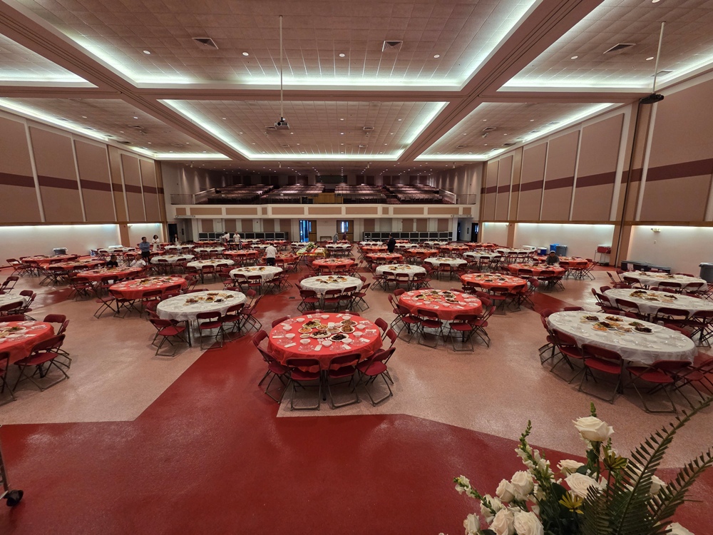 Từ sân khấu của Hội trường nhìn xuống một vòng các bàn tiệc