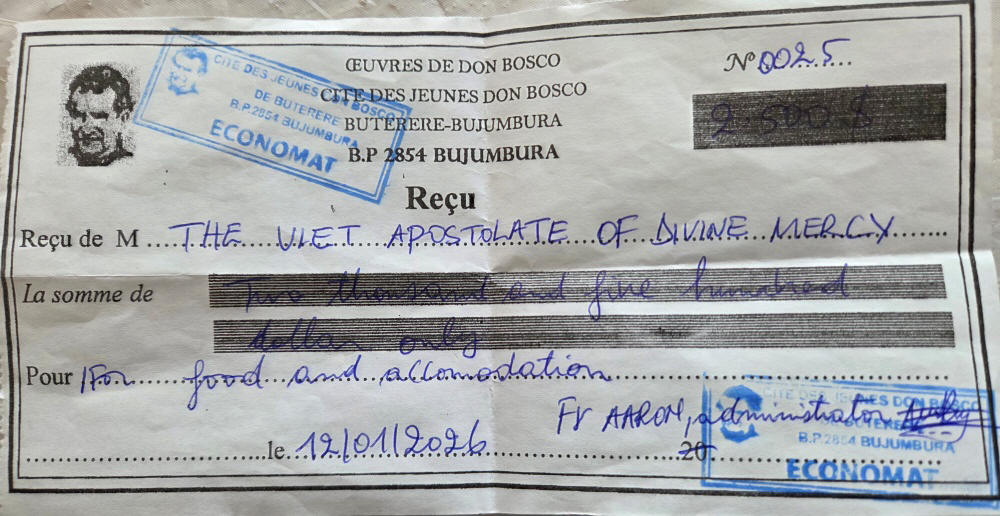 Tạ ơn LTXC. Nhóm TĐCTT chúng ta vừa chuyển ngân $2,500.00 để hỗ trợ việc truyền giáo của Dòng Don Bosco ở Trung Tâm Don Bosco ở Buterere - The Don Bosco Buterere Center, nơi phái đoàn hành trình Burundi của Cha Phạm Ngọc Tuấn sẽ trú ngụ trong suốt thời gian thăm viếng và thăm dò truyền giáo ở Phi Châu từ nước Burundi nhỏ bé dễ thương này trong vòng 6/10 ngày (13-22/3/2026).