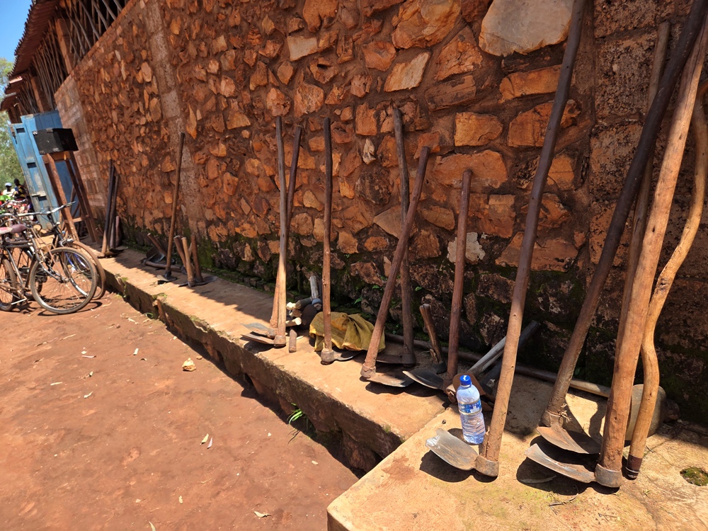 Nhiều cái cuốc được để dựa vào tường của ngôi nhà thờ đang được sử dụng để chủ nhân của chúng tập họp đón phái đoàn