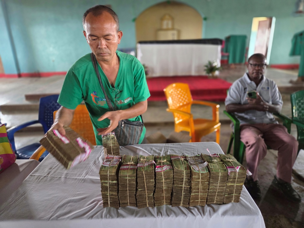 Thày Đoàn Văn Tấn, SDB, đếm đủ số tiền để phân tặng đồng đều cho 1000 gia đình ở Giáo xứ này