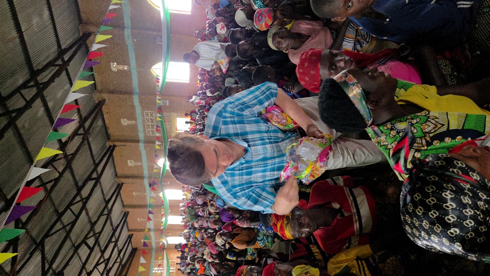 Trong khi phát kẹo chung mua ở Burundi cho từng người ở từng hàng ghế,