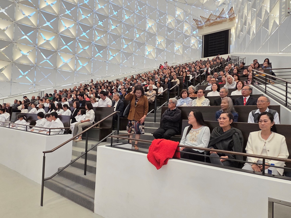 Vị linh mục mặc thường phục được mời lên ban phép lành kết thúc phần thiêng liêng trước tiệc mừng