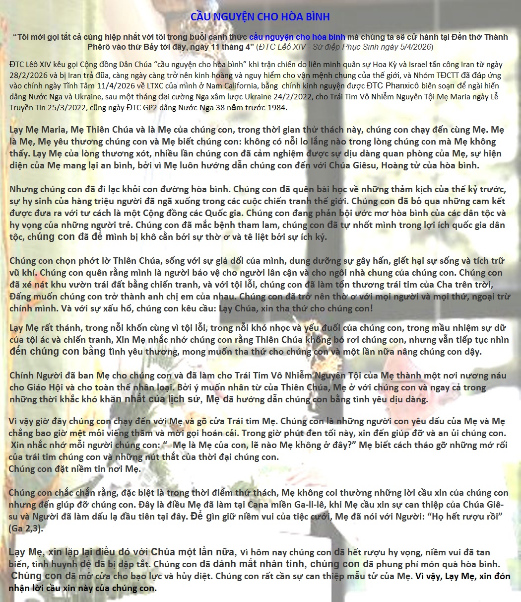 Bản kinh dài 2 trang này của ĐTC Phanxicô từ ngày Lễ LTXC CN 12/4/2026 được Nhóm TĐCTT 2 giờ kinh hằng ngày đọc vào giờ kinh trưa