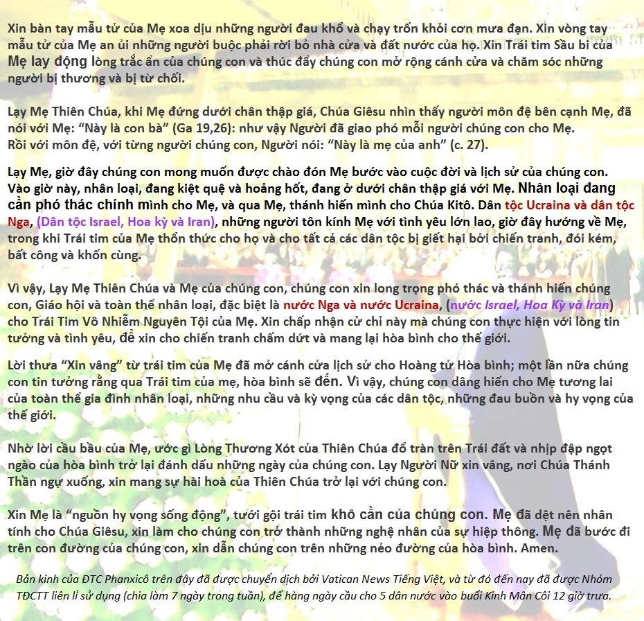 bằng chính bản Kinh được ĐTC Phanxicô soạn dọn để ngài đích thân hiến dâng Nước Nga và Ukraine cho Trái Tim Vô Nhiễm Nguyên Tội Mẹ Maria ngày 25/3/2022 sau đây: