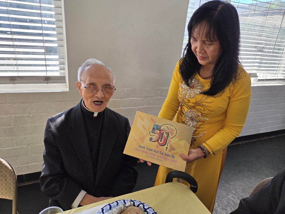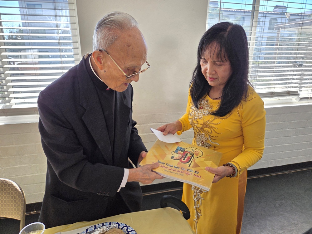 Món quà bào gồm cuốn Kỷ yếu 50 Năm Hành Trình Đức Tin Viễn Xứ của CĐ CG VN GP Orange và 1 bao thư hiện kim