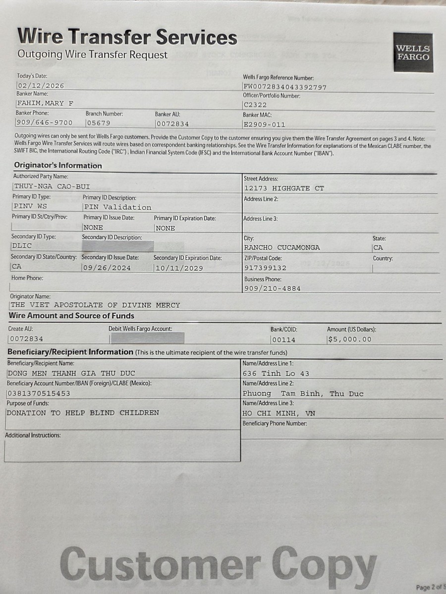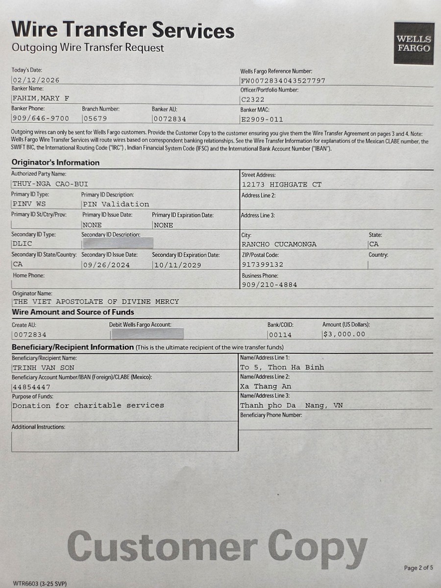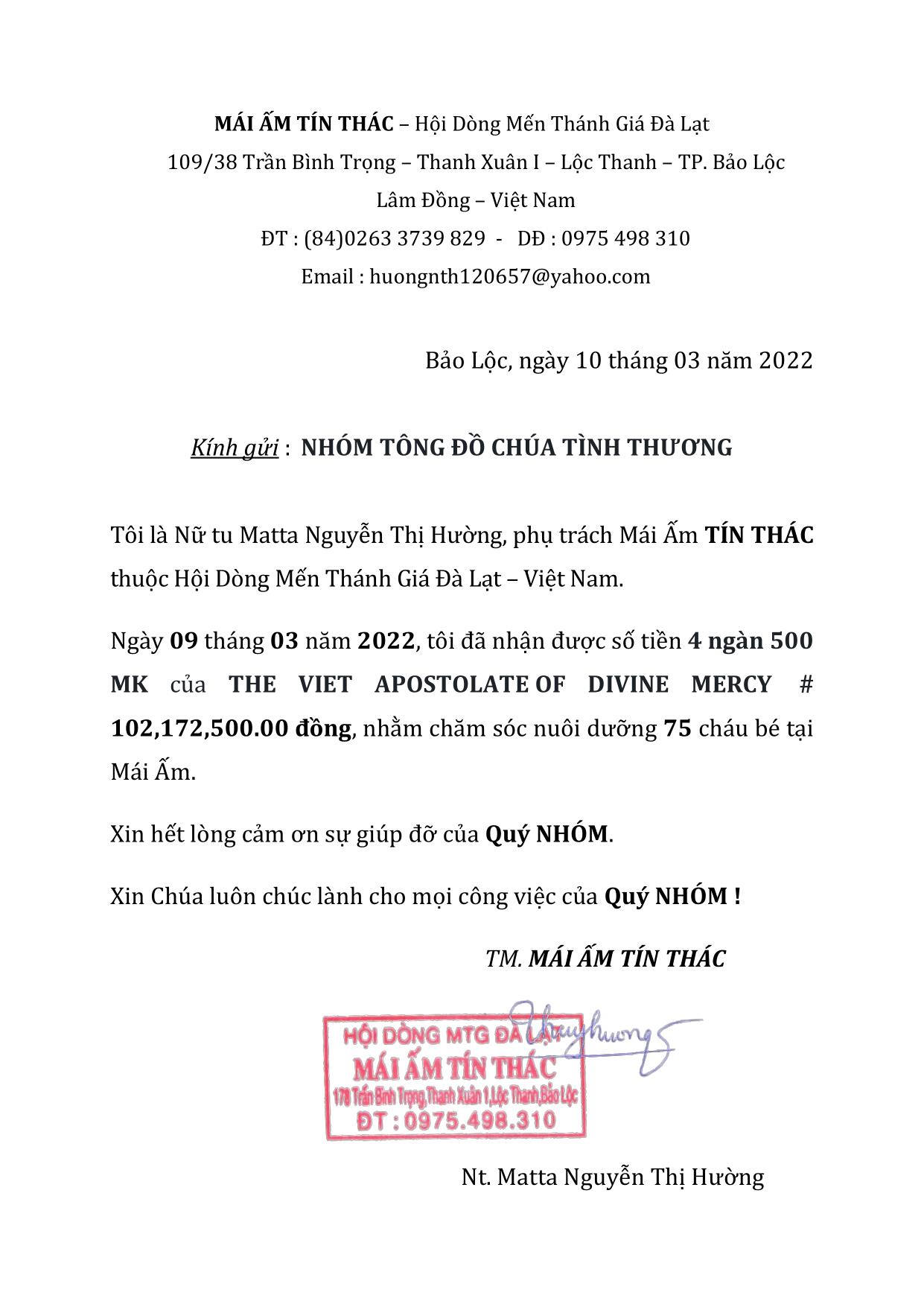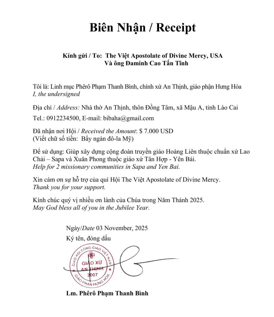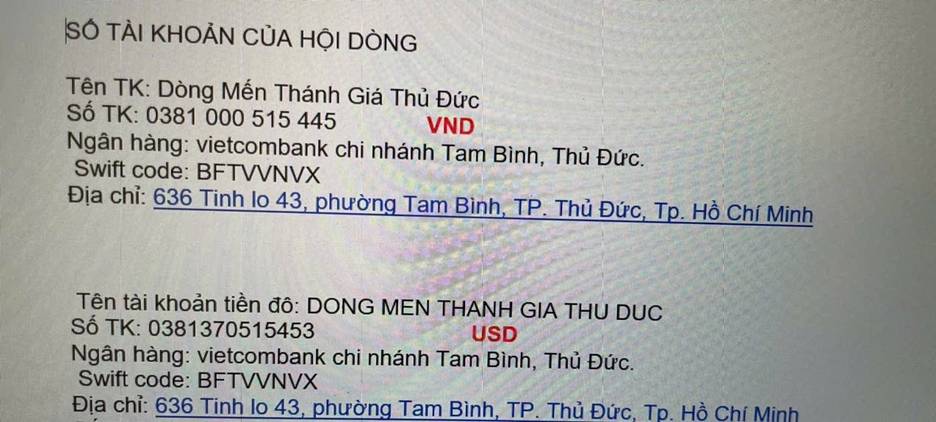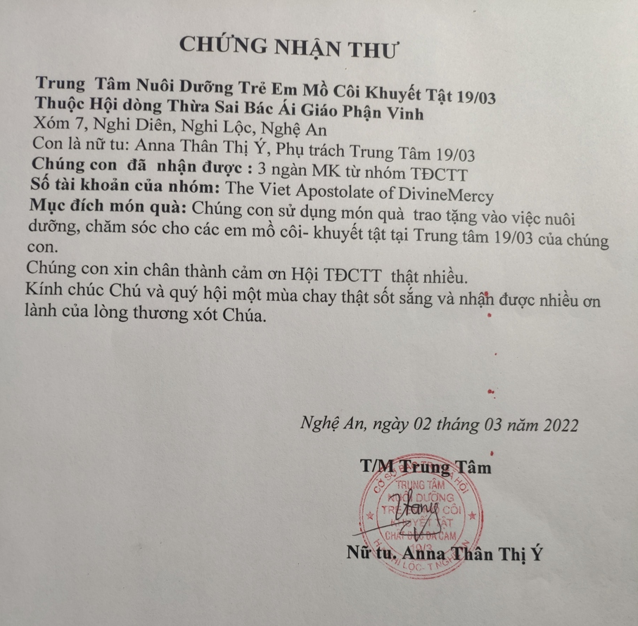 Viet Apostolate of Divine Mercy số tiền quý AC muốn đóng