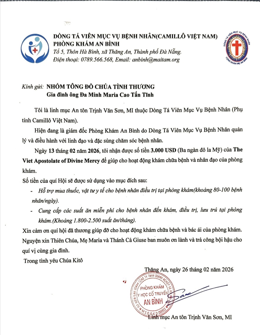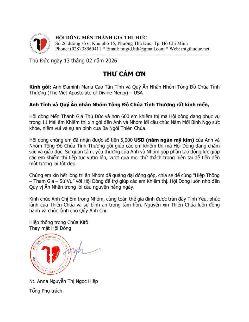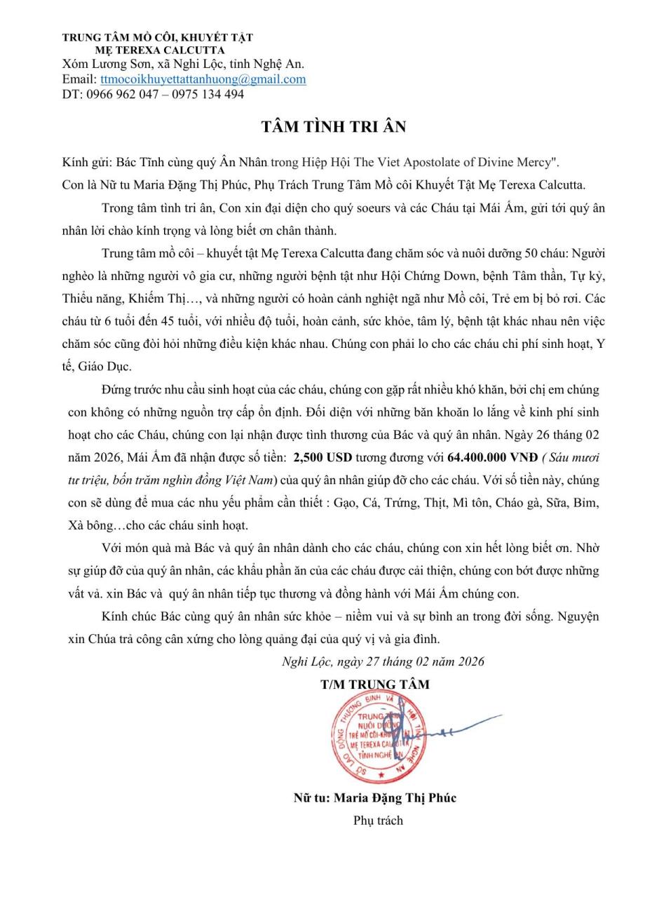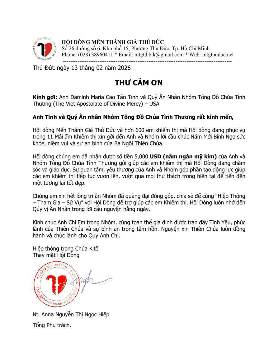 Tạ ơn LTXC đã tiềp tục "động lòng thương" nơi một số tâm hồn anh chị em TĐCTT chúng ta, nhờ đó chúng ta mới có được một Quỹ Bác Ái 2026 vừa đủ để phân tặng cho 3 dòng tu, 1 nam và 2 nữ, đang phục vụ bác ái xã hội ở Việt Nam, và cả 3 nơi này đều đã gửi Chứng Nhận Thư tri ân cảm tạ hành động "hiệp thông tham gia sứ vụ - communion, participation and mission" thừa sai bác ái của chúng ta với các vị: