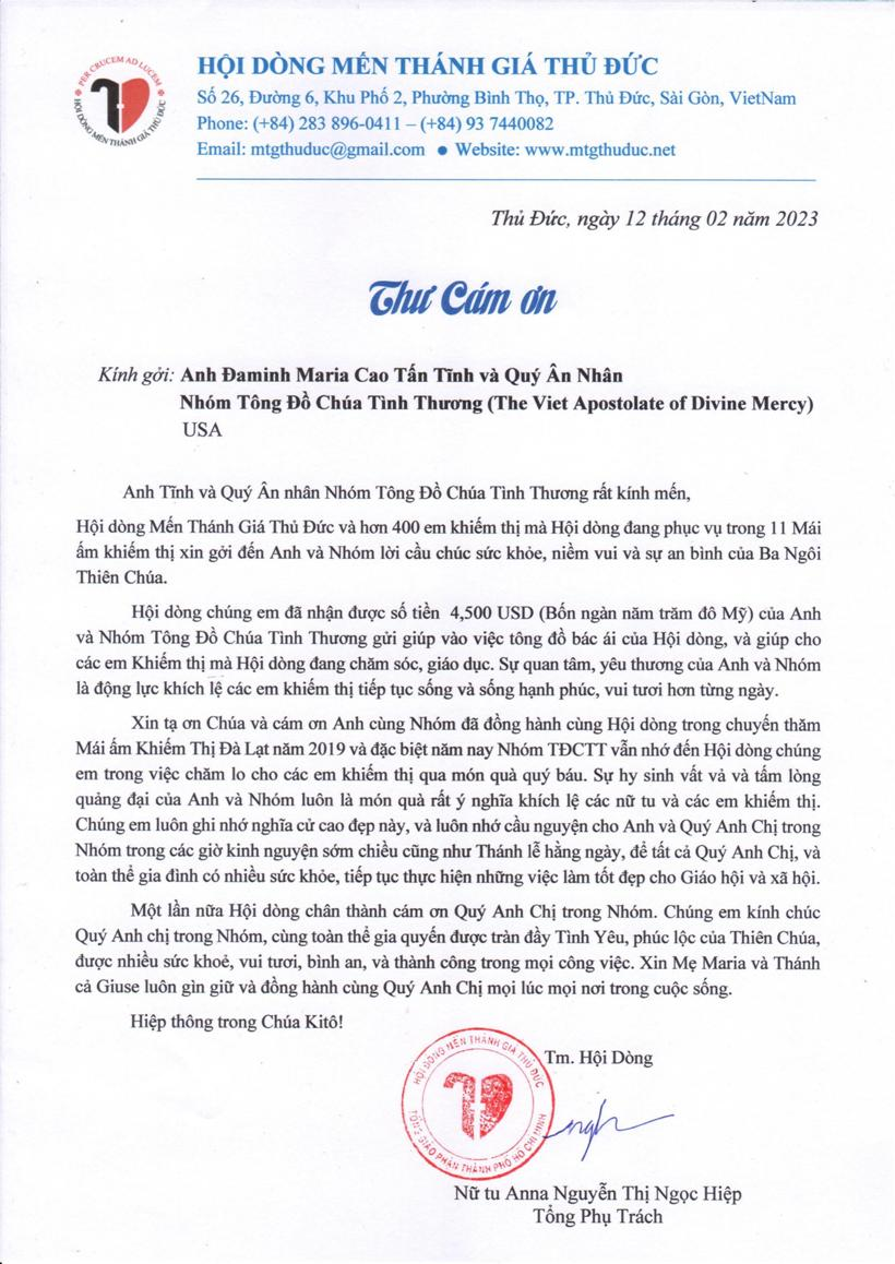 Em xin kính gửi đến Anh thư cảm ơn của Chị Tổng Phụ trách Hội dòng, được đính kèm trong email này, để bày tỏ lòng tri ân đối với sự quảng đại và nghĩa tình mà Anh cùng Nhóm Tông Đồ Chúa Tình Thương đã dành cho Hội dòng chúng em.