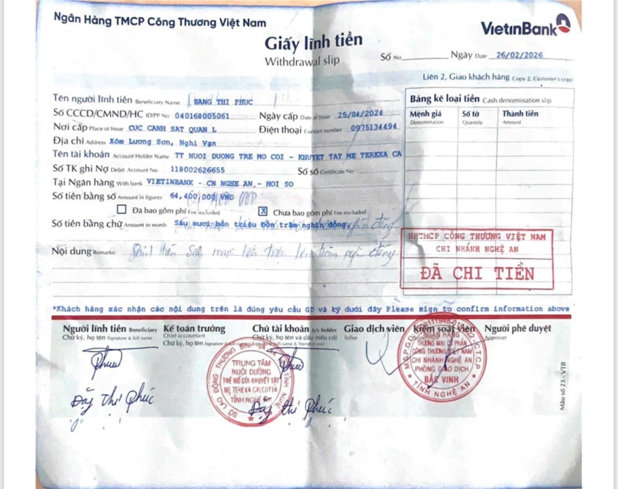 $3,000.00 - Trung tâm Nuôi dưỡng 50 Trẻ Mồ côi Khuyết tật Mẹ Têrêxa Calcutta ở Nghệ An của Dòng Nữ Thừa Sai Bác Ái GP Vinh,